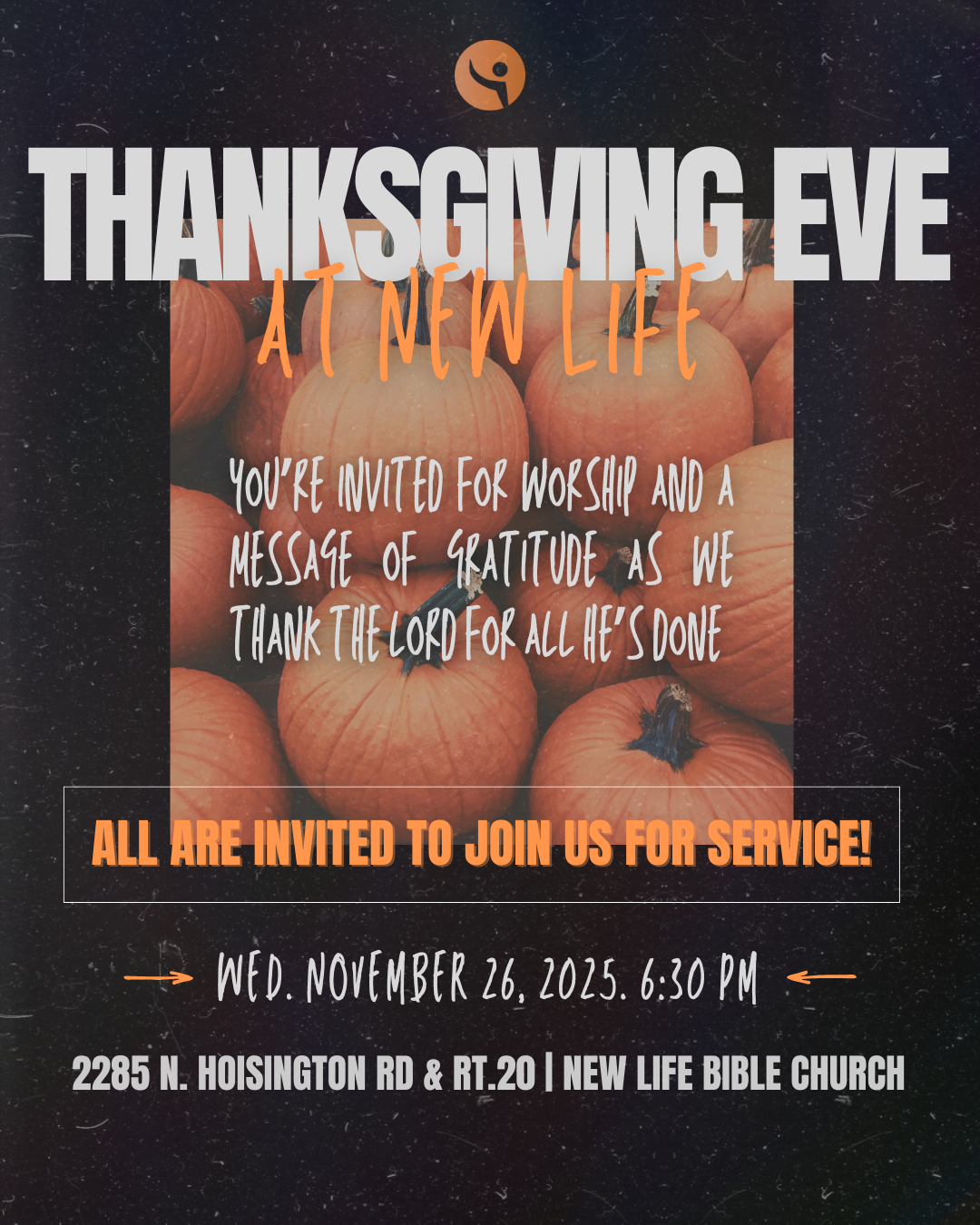 2285 N. Hoisington Rd. & Rt. 20, Pecatonica, IL | Wednesday, November 26th at 6:30pm | New Life Bible Church
